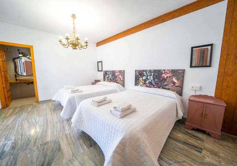 The main living room and one of the downstairs bedrooms (Cerezo) open directly onto the outdoor porch, where the pool is located.